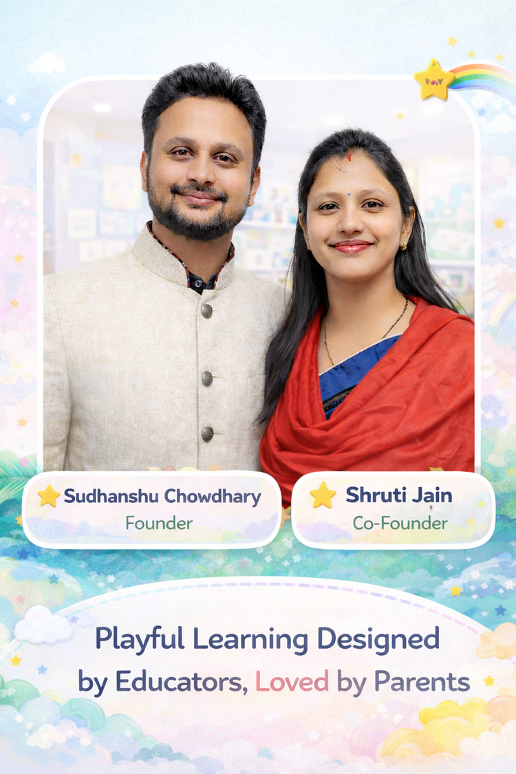 At the heart of our journey is a simple belief: every child learns best when they feel confident, curious, and happy. Started in 2018 by educators and life partners Sudhanshu Chowdhary and Shruti Jain, our journey began with Mabel Kids Pre School in Sagar, Madhya Pradesh, India. By working closely with parents, they saw a real need for fun, skill-building, affordable activities that also reduce screen time.