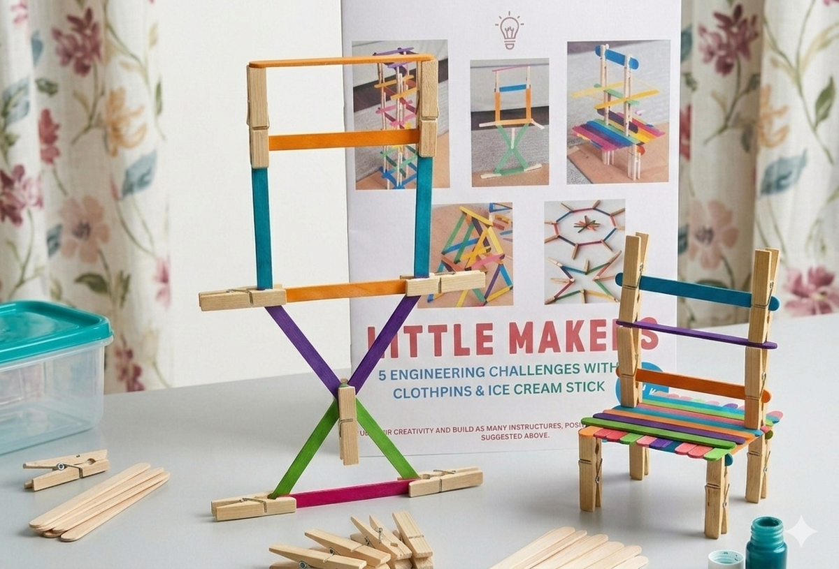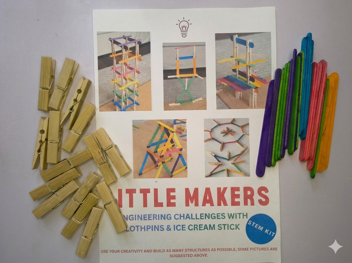Cutykids Little Makers: 5-in-1 STEM Engineering Kit – DIY Building Set with Wooden Pegs & Colorful Ice Cream Sticks